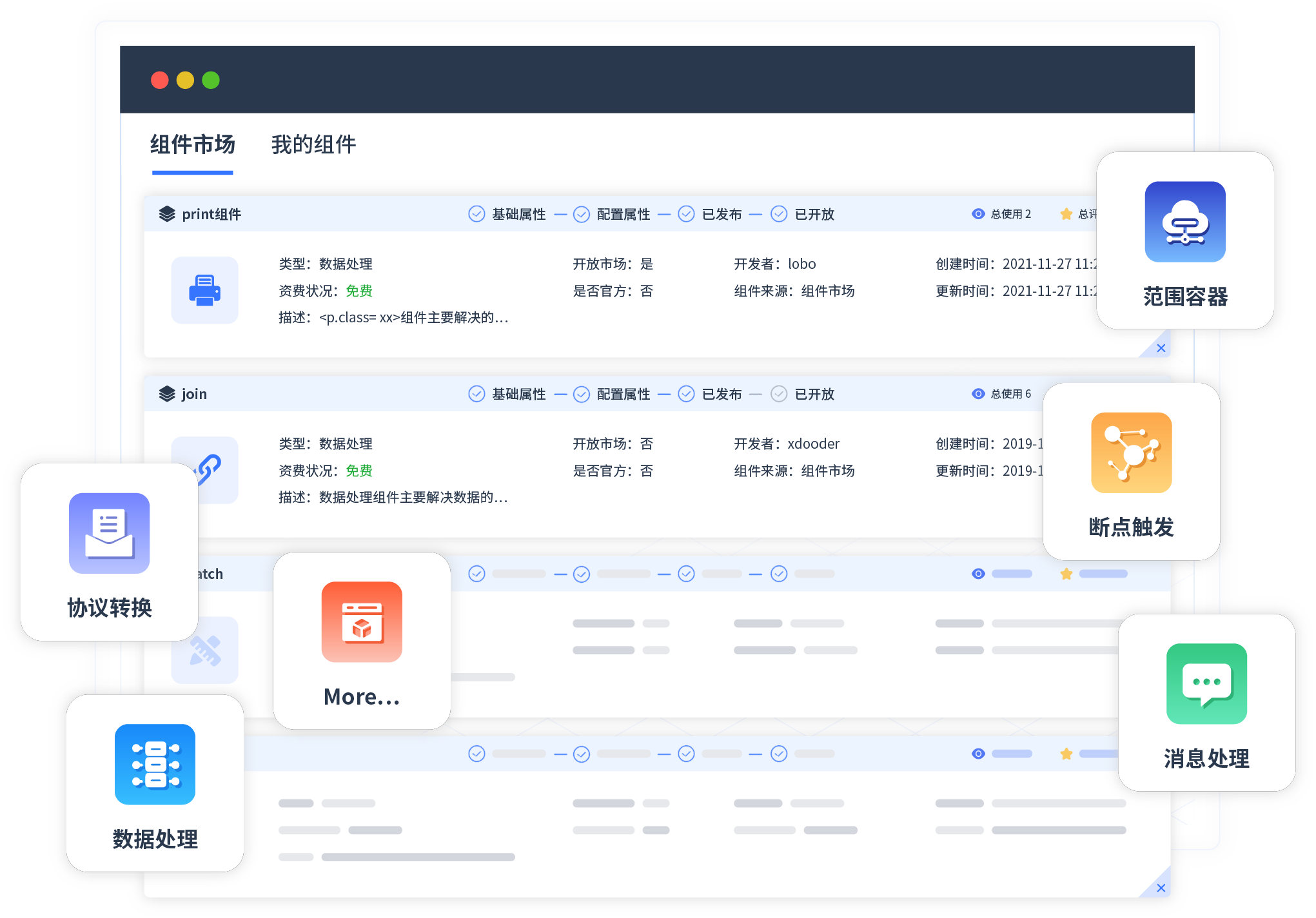 针对集成场景,鼎天国际提供组件市场,例如协议转换、消息处理、文件操作等。除平台提供的组件外,客户可以自定义所需组件。